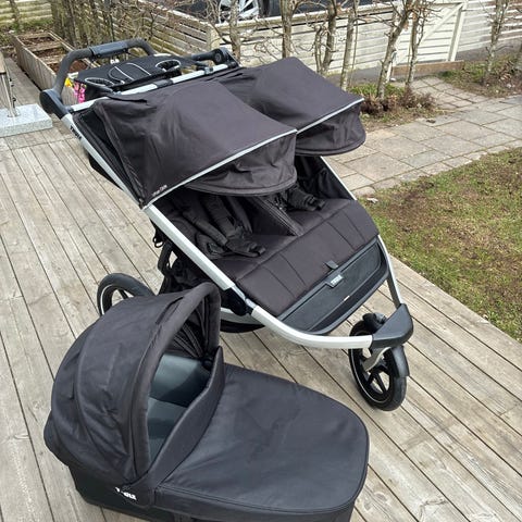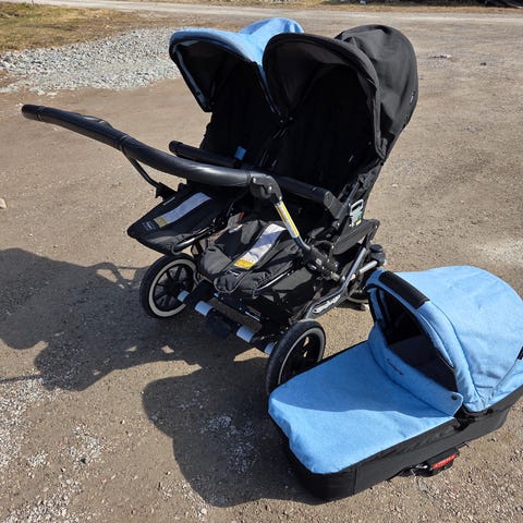 Mountain Buggy syskonvagn med liggdel i blå textil. Vagnen har ett chassi med tre hjul, varav ett svängbart framhjul, samt separat liggdel som kan fästas på chassit. Sittdelen har sufflett och varukorg undertill. Liggdelens klädsel är i matchande blå färg med bärremmar och justerbar sufflett. Passar för transport av ett mindre barn i liggdel och ett större barn i sittdel.