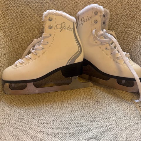 Spin konståkningsskridskor för barn i storlek 33. Vita skridskor med snörning och hög ankel för stöd. Blad i metall med taggar framtill. Ovandel i syntetmaterial med ljus pälsfodrad kant upptill för extra komfort. Passar för barn som åker konståkning eller fritidsskridskor på is.