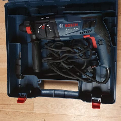 Bosch AdvancedImpact 900 slagborr med kabel i plastväska. Slagborrmaskinen är nätansluten och har inställningsratt för två hastigheter. Levereras i originalförvaringslåda med formgjutet fack för maskinen och tillbehör.