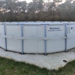 Poolutrustning med flera delar för poolinstallation. I lådan syns bland annat poollampor, två rostfria rör/badstegar samt olika plast- och metallkomponenter och kopplingar. Utrustningen är avsedd för montering i pool och innehåller delar för cirkulation, belysning och anslutningar. Exakta specifikationer, mått och fabrikat framgår inte av bilderna och bör kontrolleras mot eventuell märkning på respektive del.