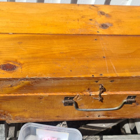 Trälåda för förvaring Lådan har lock och metallhandtag på sidorna för enklare hantering. Passar för förvaring av verktyg, utrustning eller andra föremål i exempelvis förråd, garage eller verkstad. Insidan är av obehandlat trä med synlig trästruktur och kvistar.