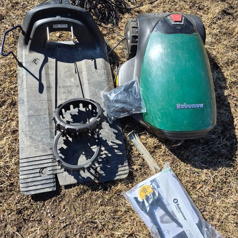 Robomow RC308 robotgräsklippare i grön färg. Modellen är märkt som Robotic Mower RC308 PRO7060C enligt typskylten. Klipparen har ett roterande knivsystem undertill och styrpanel med display och knappar för start, stopp och inställningar på ovansidan. Enheten är avsedd för automatisk gräsklippning inom ett avgränsat område i trädgården med hjälp av begränsningskabel. Drivs med inbyggt uppladdningsbart batteri och laddas via laddstation (synlig på bilderna). Tillverkad 2017 och klassad enligt IPX4 för stänkskydd. Maskinen är avsedd för privat användning i trädgård och gräsmatta.