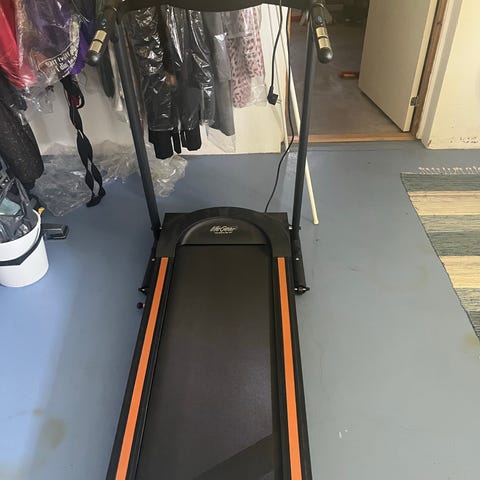 Löpband i svart färg. Utrustad med säkerhetslina framtill. Passar för inomhusträning och gång- eller löppass hemma. Kan fällas upp för att spara plats vid förvaring.
