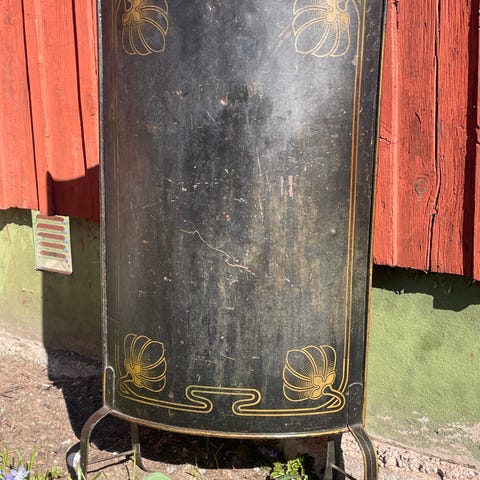 Väggmonterad förvaringslåda i metall med rostbrun yta. Övre delen har flera krokar för upphängning av exempelvis redskap eller nycklar. Nedre delen består av en öppen låda som kan användas för förvaring av mindre föremål. Dekorativa utskärningar upptill. Passar för användning inomhus eller under tak utomhus beroende på önskemål om utseende och patina. Tillexempel för blommor eller belysning i ett uterum.