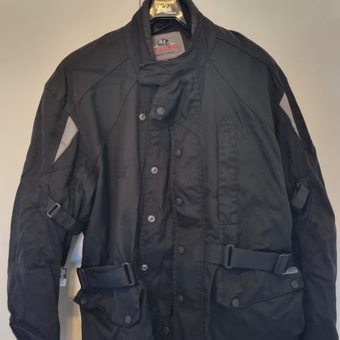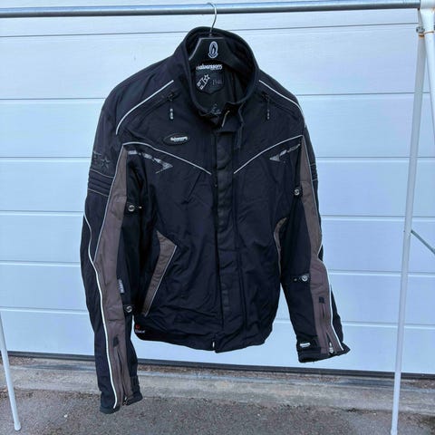 MC‑ställ märket jofama. Bestående av jacka och byxa i svart textil med röda detaljer på ena jackan. Jackorna har flera ytterfickor, dragkedja och tryckknappar.