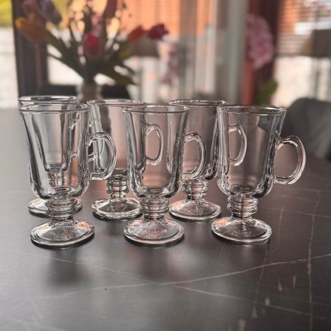 Säljer 5 st eleganta Irish coffee-glas med fot och handtag. Perfekta för kaffe, glögg, latte eller dessert.