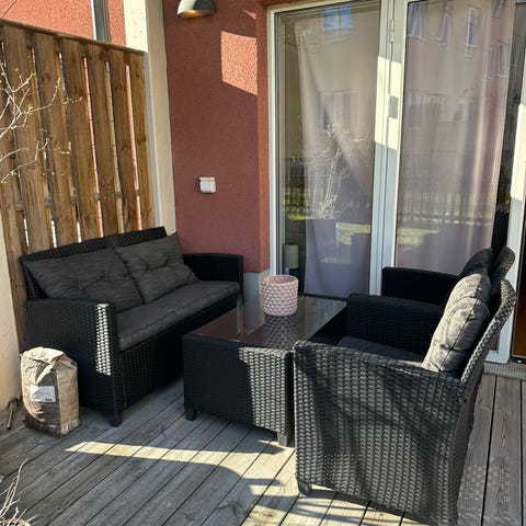 IKEA SEGERÖN Balkonggrupp bestående av två soffdelar med beige sitt- och ryggdynor samt ett runt metallbord. Soffdelarna har metallstomme och raka ben, med tjocka lösa dynor för sits och rygg. Bordet är runt med perforerad metallskiva och kryssben. Passar för placering på balkong eller mindre uteplats. Färgskala i ljus beige och ljus metallton.
