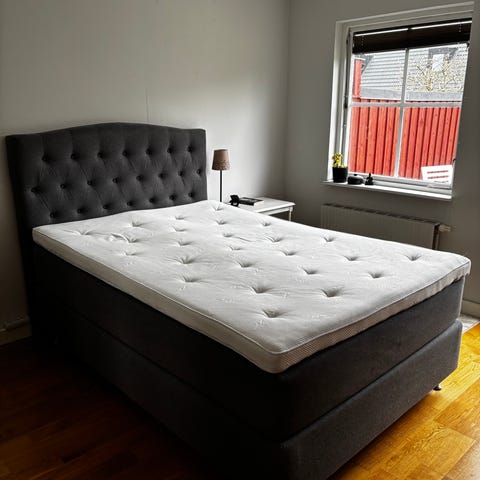 KungSängen säng med två resårbottnar och en överliggande bäddmadrass. Relativt fast att ligga på.