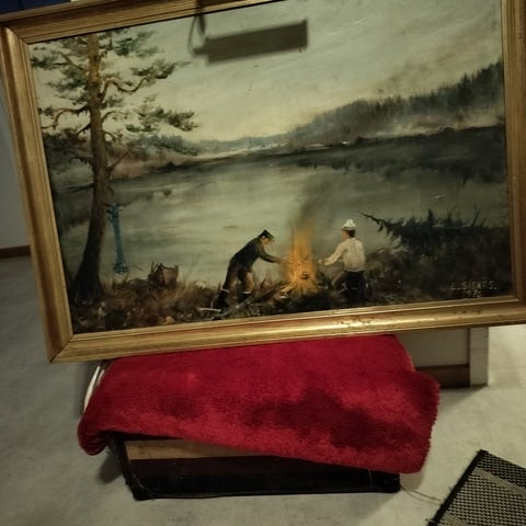 Grindslanten med mått 90*60 cm på duk.Finns färgbortfall på ramen.