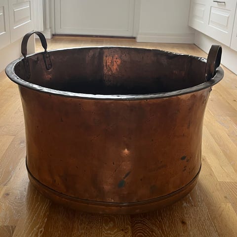 Stor balja med järnstativ. 40 cm djup, 60 cm diam innermått. Tennlagning finns, i övrigt felfri.