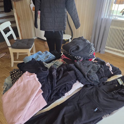 6 par jeans, 7 långärmade skjortor, 28 T-shirts, 5 övriga byxor, 5 tjocktröjor, 6 linnen, 4 kortärmade skjortor, 1 träningsset från woxo