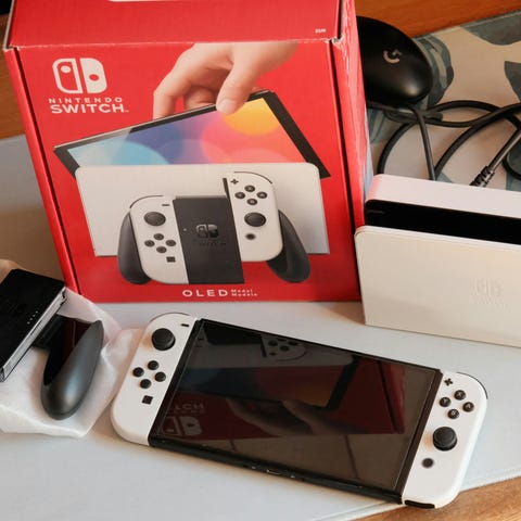 Nintendo Switch OLED spelkonsol med vita Joy-Con’s i snudd på nyskick, söker ny ägare.