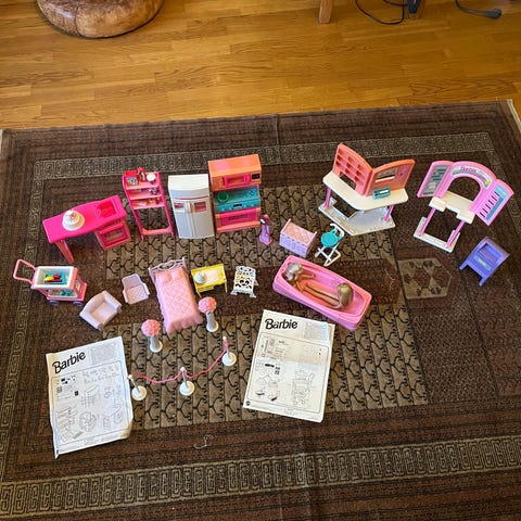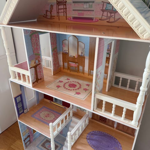 Barbie dockskåp med flera våningar i rosa färg. Dockskåpet har flera rum med tryckta inredningsdetaljer som vardagsrum, kök, badrum och sovrum. Öppen framsida ger lätt åtkomst till alla våningar. Passar för lek med Barbie-dockor och liknande mode dockor i liknande storlek. Tillverkat främst i trä och plast med tryckta väggar och golv i rosa och svart ton.
