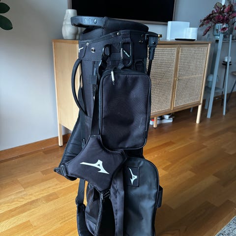 Mizuno golfbag standbag i blått med vita detaljer. Väskan har benstativ för att kunna stå upp själv på marken. Flera fack för klubbor med avdelare upptill samt ytterfickor för tillbehör som bollar, handskar och andra småsaker. Bärremmar gör den lämplig att bära under en runda på golfbanan.