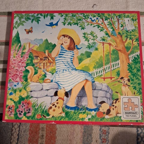 Jumbo 4 Puzzles barnpussel med motiv av bondgårdsdjur. Förpackningen innehåller fyra separata pussel med olika antal bitar: 4, 6, 9 och 16 bitar. Motiven föreställer hund, ko, höna och katt i lantlig miljö. Pusslen är anpassade för yngre barn och levereras i originalkartong.