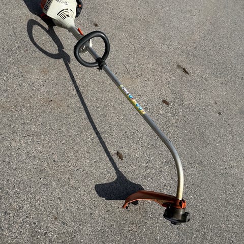 Stihl grästrimmer för trimning av gräs och kanter i trädgård och runt gångar. Bensindriven modell med böjt riggrör och loophandtag för bättre kontroll vid arbete. Klipphuvud anpassat för trimtråd. Passar för underhåll av gräsmattor, runt rabatter, staket och andra svåråtkomliga ytor där vanlig gräsklippare inte kommer åt.