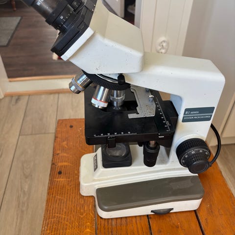 BMS 76238 mikroskop. Bordsmodell med inbyggd belysning och vinklingsbart okularhuvud. Mikroskopet ansluts med medföljande strömkabel. Tillbehör som petriskålar och mindre tillbehörslåda ingår enligt bild. Lämpligt för enklare laboratorie- eller undervisningsbruk beroende på behov och specifikationer från tillverkaren.