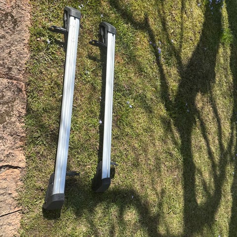 Audi takräcke i aluminium. Består av två lasthållare med svarta plaständar och gummilister.