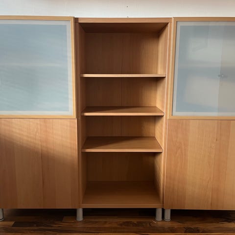 En med glasdörrar och de två andra med dörrar över halva hyllan.