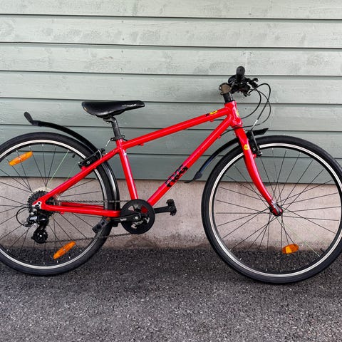 En mycket trevlig barncykel med lätt vikt från Frog bikes, storlek 62 med 24" hjul. Passar barn med en minsta innerbenslängd på 62 cm. Cykeln funkar utmärkt och har förvarats inomhus. Bra skick med några mindre skavanker. Det saknas en reflex bak.