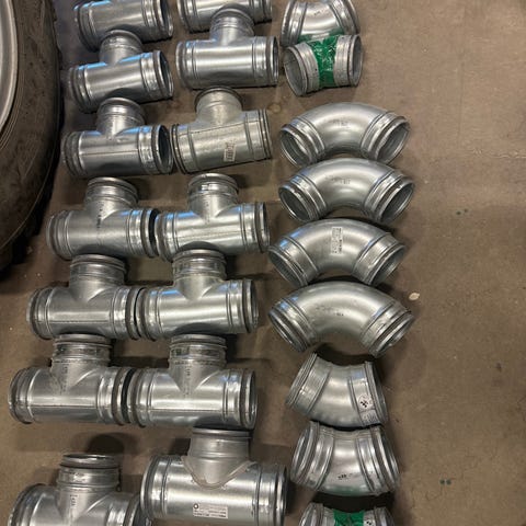 Ventilationsdelar i form av olika rördelar i galvaniserad metall. Blandade böjar, skarvar och rörsektioner som kan användas för uppbyggnad eller komplettering av ventilationssystem. Passar exempelvis för kanalsystem i garage, förråd eller andra utrymmen där plåtventilation används.