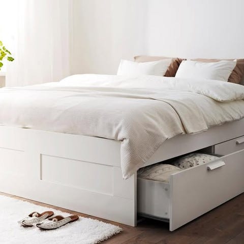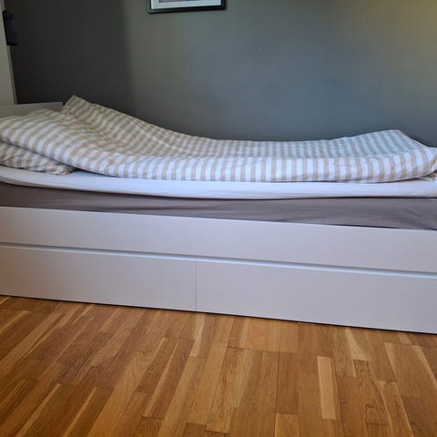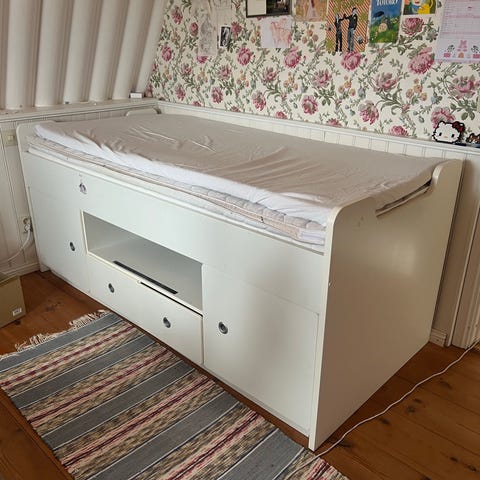 Ikea säng med förvaring i vit färg. Sängen har utdragslådor på sidorna som ger extra förvaringsutrymme för till exempel kläder, sängkläder eller andra textilier. Passar i sovrum där man vill kombinera säng och förvaring på en yteffektiv yta. Sängramen är låg och omger madrassen på alla sidor. Madrass ingår inte nödvändigtvis utan kan behöva köpas till separat beroende på uppsättning.
