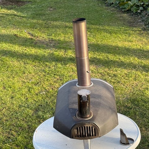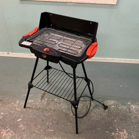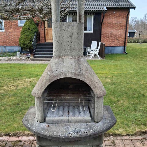 Murad utegrill med huva i betong. Grillen har eldstad med galler i metall och plats för ved eller kol under gallret. Konstruktionen är avsed för fast montering utomhus, exempelvis på altan eller i trädgård. Passar för matlagning över öppen eld eller kolgrillning. Huven hjälper till att leda bort rök uppåt.