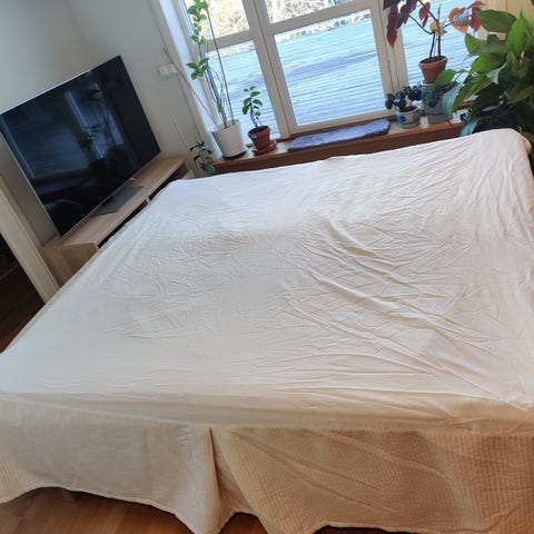 IKEA sultan säng med två resårmadrasser i vit färg. Sängen består av två separata bottnar som tillsammans bildar en större liggyta. Ovanpå ligger en vit bäddmadrass som täcker hela sängen. Passar som dubbelsäng i sovrum eller gästrum. Madrasserna har quiltad ovansida och är klädda i ljust tyg. Sängen placeras direkt på golvet eller kan kompletteras med ben enligt önskemål, beroende på modell och tillbehör från IKEA.
