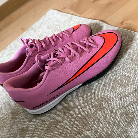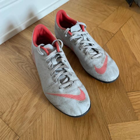 Nike fotbollsskor i storlek 38. Skorna är vita med svarta och röda detaljer. Lågt skaft med snörning framtill och tunn yttersula anpassad för fotbollsspel. Passar för fotbollsträning och matchspel.