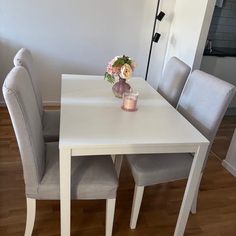 Matbord Norråker från Ikea med tillhörande bänk och stolar.