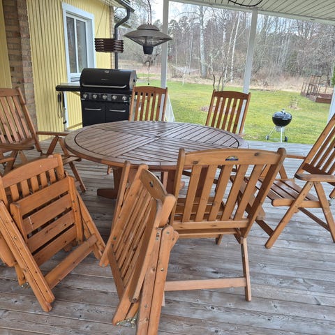 Bord 1,5m med 2 klaffar blir bordet 2,40m bredd 90 cm. 2 stolar. Vitt/ blått parasoll, med vit parasollfot. Paketpris 1000kr. Eller lägg bud på var för sig . Finns i Mariefred