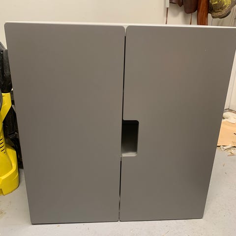 2 stycken stuva skåp som är ihopskruvade i varandra med ben. Omlackerade till grått.