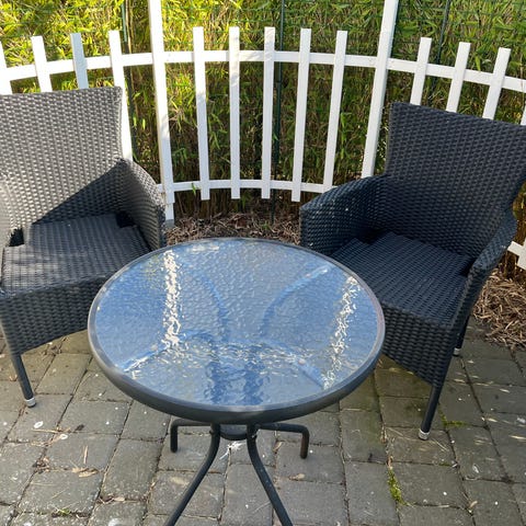 Säljer ett fint café bestående av glasbord och sköna fåtföljer i konstrotting.