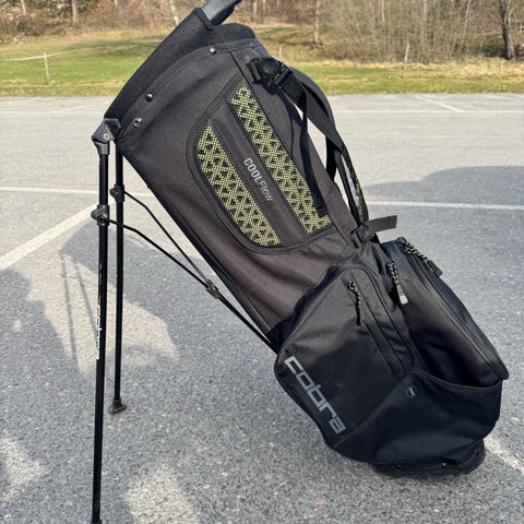Nike Golf bärbag för golfklubbor i gråbeige färg med mörka detaljer. Utrustad med utfällbara ben för att kunna stå stabilt på marken. Flera fickor med dragkedja för förvaring av bollar, peggar och tillbehör. Bärremmar för att kunna bäras på axeln. Passar för golfspelare som vill ha en lättare bärbag med grundläggande förvaringsmöjligheter.