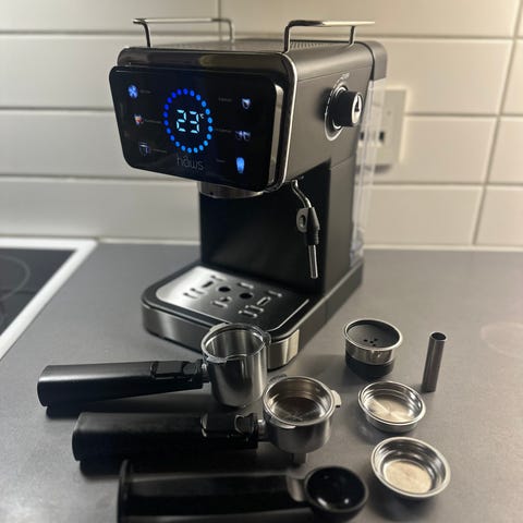 Maskinen är avsedd för att brygga espresso och har plats för två koppar samtidigt. Den levereras med portafilter/handtag, droppbricka och instruktionsbok. På framsidan finns reglage för bryggning och ånga samt en ångpip för skumning av mjölk. Maskinen har en avtagbar vattenbehållare på baksidan och uppsamlingsbricka för spill undertill.