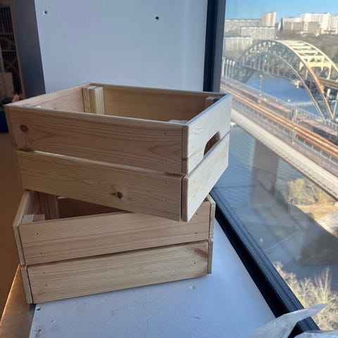 Trälåda i svartmålat trä. Lådan har öppna ribbor på sidor och botten vilket gör den lämplig för förvaring eller dekoration, exempelvis för verktyg, trädgårdsredskap eller som inredningsdetalj inomhus eller utomhus.