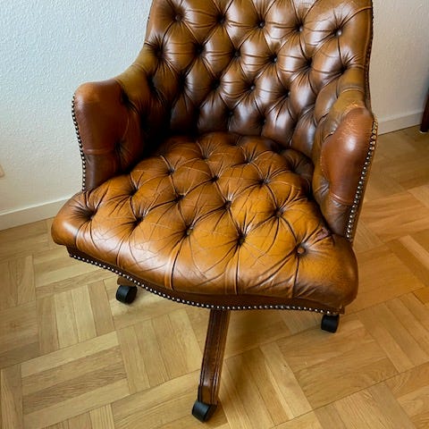 En skrivbordsstol/snurrfotölj modell Chesterfield i skinn som visas på ena bilden säljes separat.