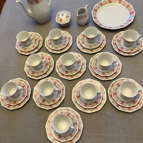 Det finns 9 st brödfat, 10 st kaffefat och 10 st koppar samt sockerskål & gräddskål. Säljes i utmärkt skick. Inga repor eller urslag. Hämtas i Sickla.