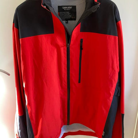 Galvin Green Gore-Tex regnställ bestående av jacka och byxor. Jackan är blå med hel dragkedja framtill, hög krage och fickor med dragkedja. Byxorna är svarta med resår i midjan, dragkedja/gylf och fickor. Både jacka och byxor är tillverkade i Gore-Tex-tyg som är avsett att vara vind- och vattentätt. Passar exempelvis för golf och andra utomhusaktiviteter i regn och blåst.