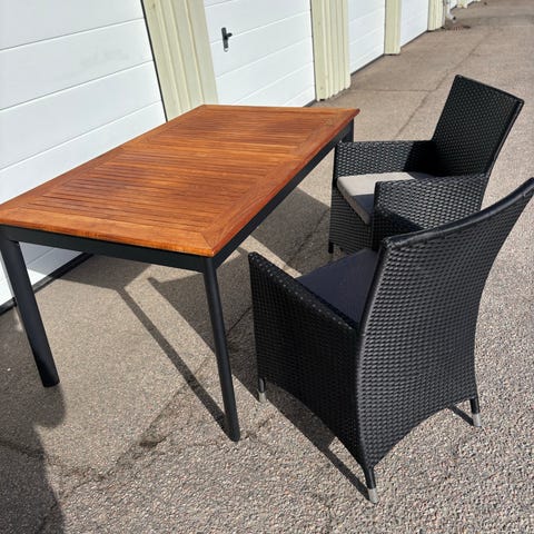 Utemöbler Ato design. 4 stolar, svarta, i konstrottning inkl bord som går att förlänga. Solsäng i svart, i konstrottning inkl dyna.