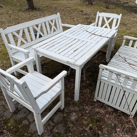 Matbordet och stolen är i bra skick. Ryggen på soffa behövs reparera.