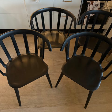 2 stolar för utomhusbruk, i svart konstrotting. Stolarna har armstöd och hög rygg samt metallstomme. Passar som utestol på altan, balkong eller i trädgård. Priset avser två stolar.
