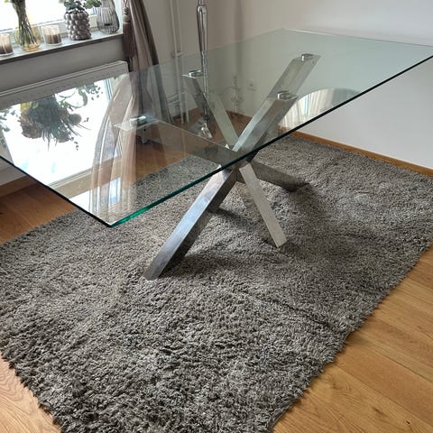 Fint glasbord med underrede i krom. Bordet har en diameter på 1m.