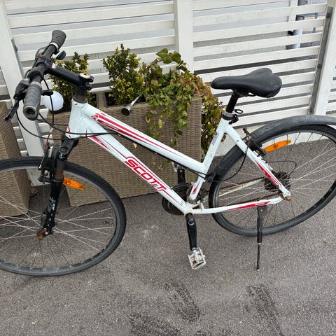 Scott Sportster dam hybrid/mountainbike med 28"/700c-hjul. Utrustad med framgaffel med dämpning och skivbromsar fram och bak. Aluminiumram (6061 double butted) för låg vikt och hållbarhet. Passar för pendling, motionskörning och lättare terrängkörning på grus- och skogsvägar. Har stått inomhus.