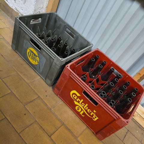 Jag har samlat dessa 76 burkar och 30 flaskor på uppdrag av en av våra döttrar under reportageresor för Rapport. Hon är sedan länge utflyttad, men de oöppnade ölförpackningarna har blivit kvar.