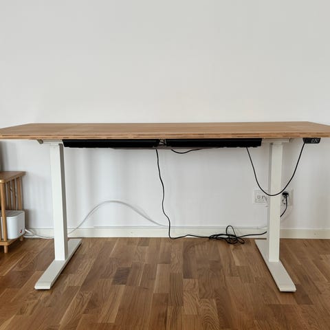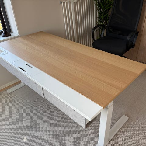 Säljer ett eldrivet höj- och sänkbart skrivbord från Brizley med bordsskiva i björk.