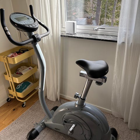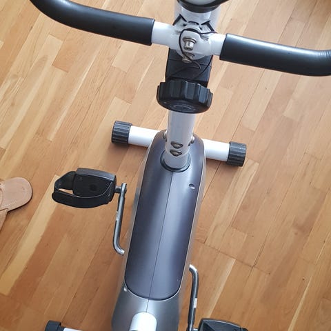 Motionscykel med digital display och justerbart motstånd. Styret har flera greppmöjligheter och en enkel kontrollpanel som visar grundläggande träningsdata. Sadelhöjden är justerbar för att passa olika användare. Cykeln är avsedd för inomhusträning och kan användas för konditionsträning, uppvärmning eller lättare rehabiliteringsträning i hemmet.
