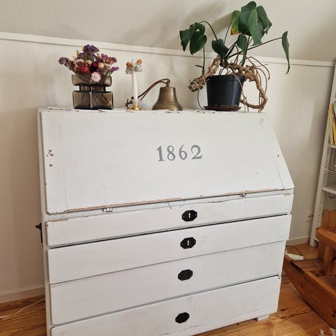 Sekretär skrivbord i vitlaserat trä. Möbeln har nedfällbar skrivskiva och invändig förvaring med flera småfack och lådor. Under skrivdelen finns tre större utdragslådor med beslag i metall.