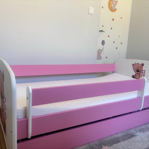 IKEA utdragbar barnsäng i rosa färg. Sängen är utdragbar och kan anpassas i längd efter barnets behov. Modellen har höga gavlar och sidoskydd som ger en ombonad känsla och kan bidra till att barnet ligger stadigt. Passar som övergångssäng från spjälsäng till större säng. Madrass ingår.