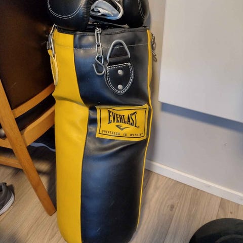 Energetics boxningssäck med tillhörande boxningshandskar. Säckens längd är cirka 60 cm och vikten är 8 kg. Diametern är cirka 25 cm